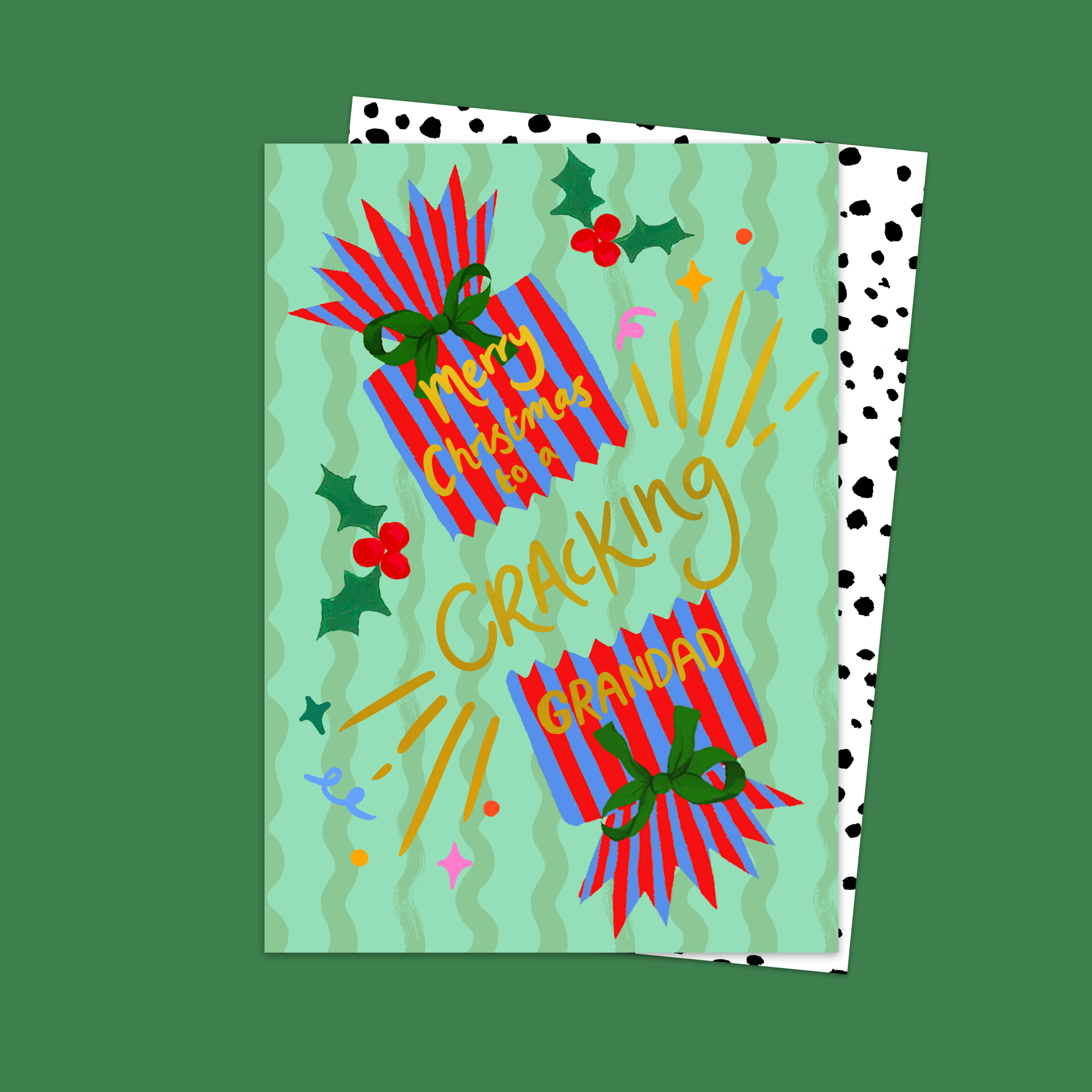 For the grandad who’s truly cracking - a beautifully crafted card, shimmering with gold foil and a playful Christmas cracker bursting with festive cheer and love.