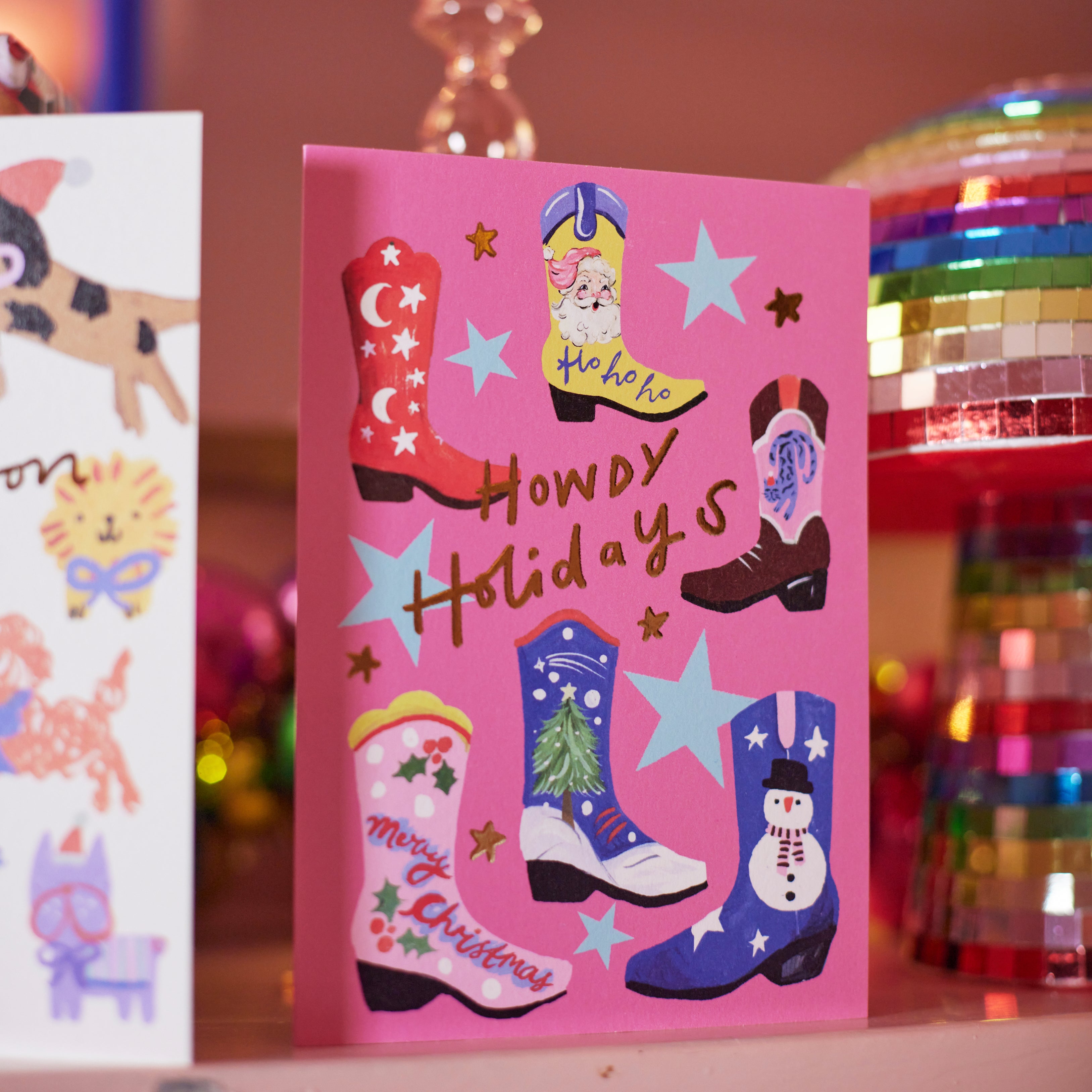 Spread holiday cheer with our festive Howdy Holidays Cowboy Boot Christmas Card! This Christmas card features fun cowboy boot illustrations and a beautiful gold "Howdy Holidays" message. Perfect for sending warm wishes to your loved ones this festive season.